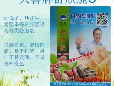 ★功能作用:采用〔舒欣脆C型〕加工制作的炒瓜子、炒花生、烤花生、烤堅果等帶殼堅果與籽類口感松脆、膨松飽滿、易于化渣、果仁不易發硬、不易變味變色。〔舒欣脆C型〕還可用于糖炒栗子等。